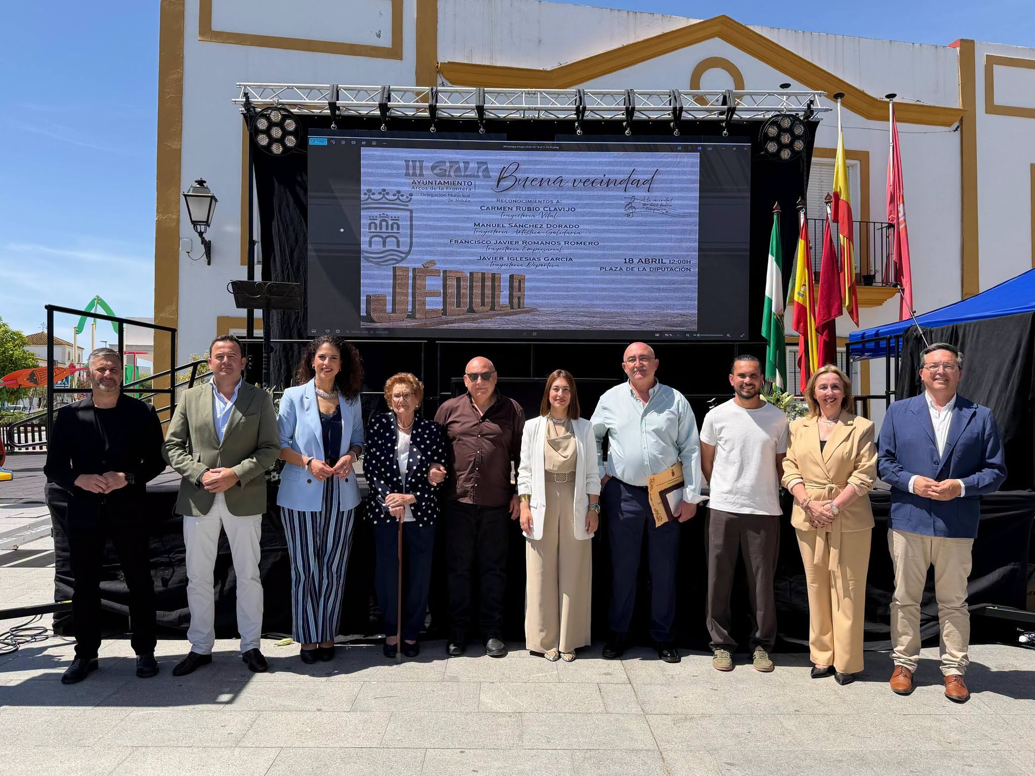 La plaza de la Diputación de Jédula ha acogido la celebración de la «III Gala Buena Vecindad» donde se ha rendido homenaje a la trayectoria, solidaridad y esfuerzo de cuatro personas. 𝐆𝐚𝐥𝐚𝐫𝐝𝐨𝐧𝐚𝐝𝐨𝐬: ▪️Carmen Rubio Clavijo, por su trayectoria vital ▪️Manuel Sánchez Dorado, por su trayectoria artístico-solidaria ▪️Francisco Javier Romanos Romero, por su trayectoria empresarial ▪️Javier